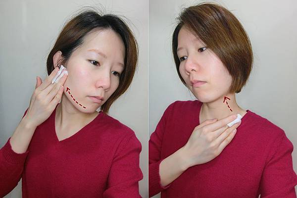 之後再往兩邊輕輕擦拭,兩頰及頸部則是由下往上輕輕擦拭,